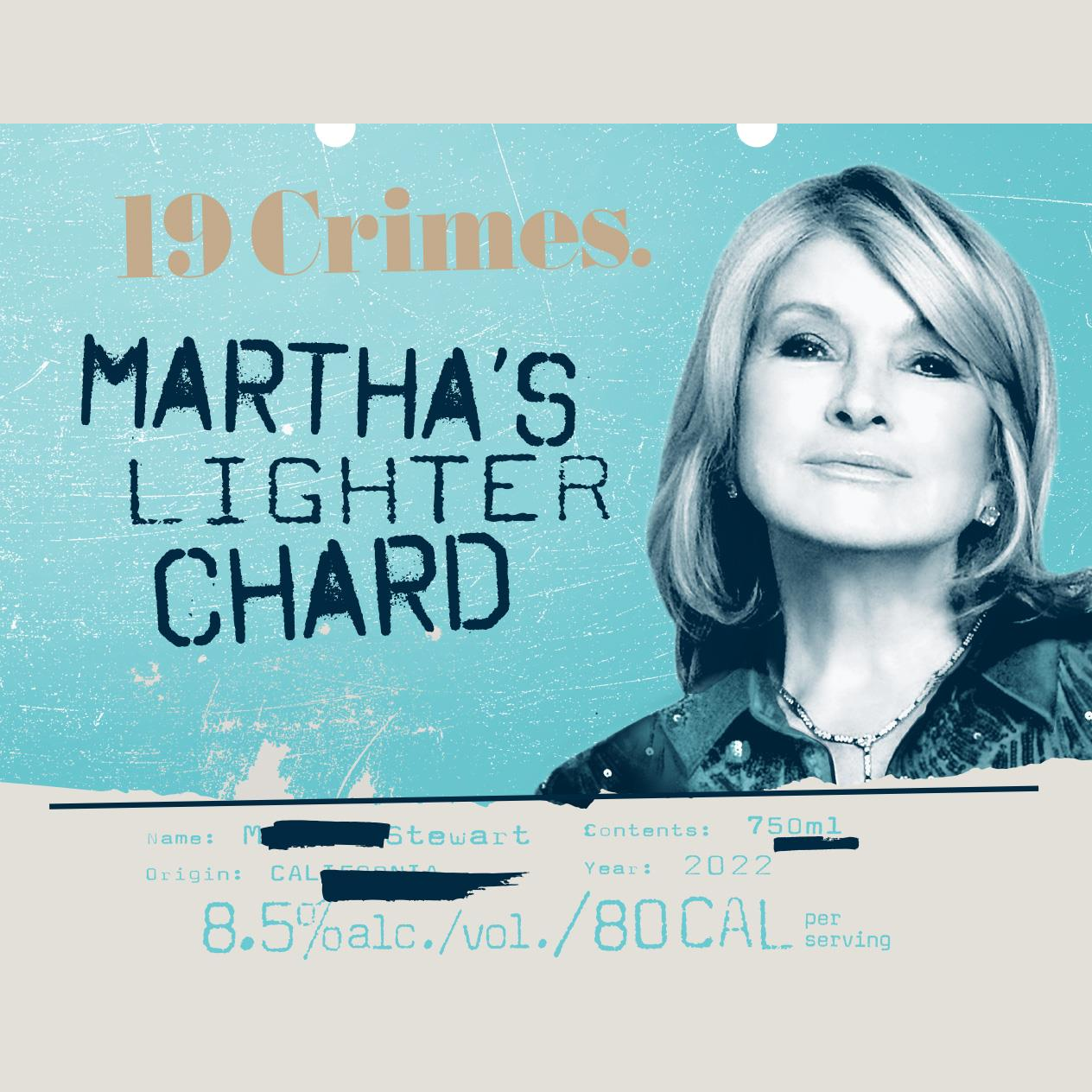 Martha Stewart's Martha's Lighter Chard is a delicious, low-calorie wine that is perfect for those who want to enjoy a glass of wine without the guilt. Made with California Chardonnay grapes, this wine is light and refreshing, with notes of apple, citrus, and oak. At just 80 calories per glass, Martha's Lighter Chard is the perfect choice for those who are watching their weight or simply want to enjoy a lighter wine.Martha's Lighter Chard is the perfect wine for any occasion. Enjoy it on its own, or pair it with a light meal like fish or chicken. This wine is also great for entertaining, as it is sure to please even the most discerning wine drinker.19 Crimes tells the true story of rule breakers who beat the odds, overcame adversity and went on to become folk heroes in their society. This spirit lives on today through innovators and culture creators like Cali’s Martha Stewart, a self-made icon who built a domestic empire. Martha’s drive embodies the timeless values of the 19 Crimes mavericks who came before her.