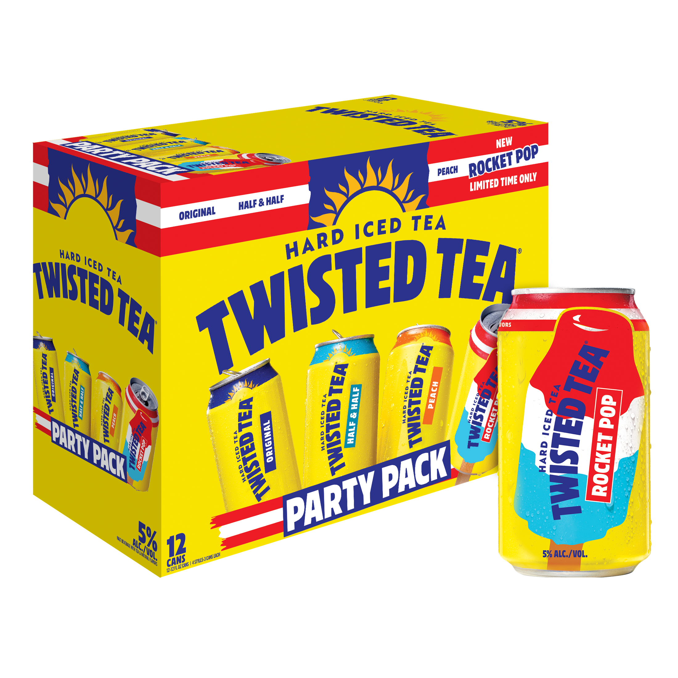 A taste as big and as bright as fireworks on the Fourth of July, this limited-edition Twisted Tea combines the bold, iconic flavors of Rocket Pop – including lemon-lime, cherry, and blue raspberry – with the smooth and delicious taste of America’s favorite hard iced tea.In addition to the new Rocket Pop flavor, Twisted Tea’s new Party Pack features Twisted Tea Original, Half & Half, and Peach, and sports an all-American makeover for a festive addition to any party.