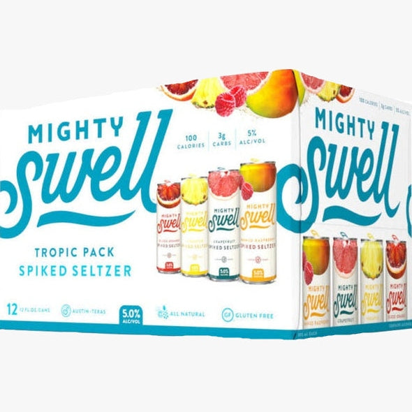 Hard Seltzer- 5.0% ABV. Mighty Swell offers a fruit forward, gluten-free seltzer with 5% ABV, only 100 calories and 3 grams of carbs. Available in four tropical flavors: Pineapple, Blood Orange, Mango Raspberry and Grapefruit.
