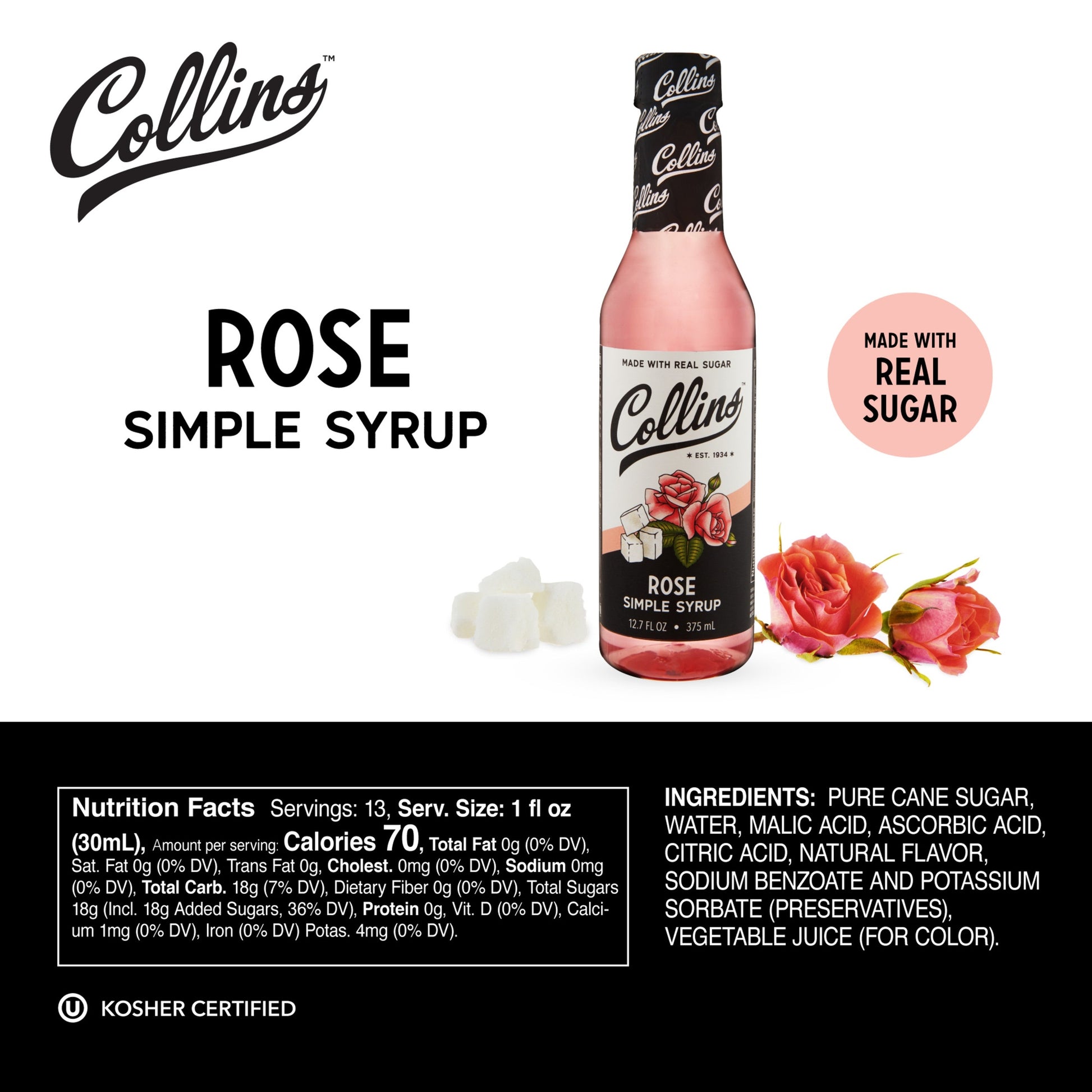 Collins Rose Simple Syrup is a staple for any home bar. Made with real sugar, it offers the perfect complement to any craft cocktail and adds a floral hint of rose flavor to drinks, desserts, and more