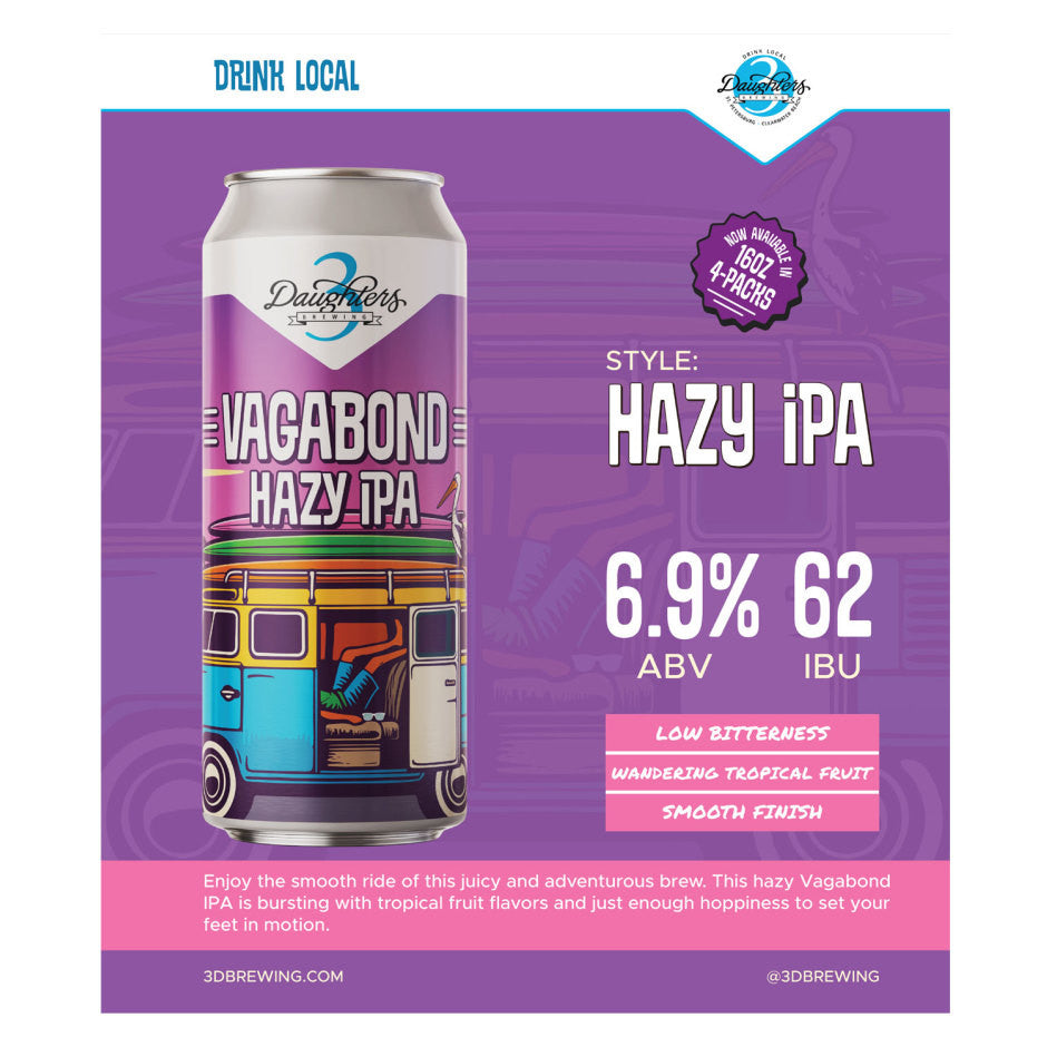 3 Daughters Brewing's Vagabond IPA delivers a bold, hop-forward experience with a perfect balance of citrus and pine notes. This American IPA showcases a crisp finish and smooth mouthfeel, making it ideal for IPA enthusiasts seeking a well-crafted brew. With its distinctive character and quality craftsmanship, Vagabond IPA is a versatile choice for any occasion—whether you're unwinding after work or sharing with friends. Discover why this Florida-brewed favorite has earned its place among craft beer lovers.