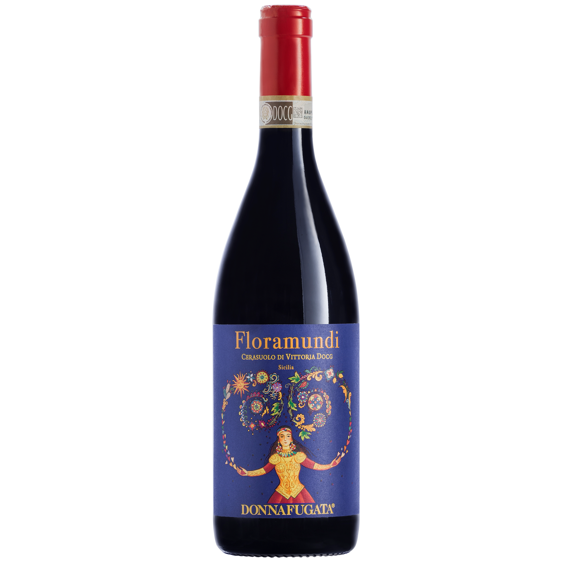 Floramundi is a fantastic figure of a woman who is giving the gift of wonderful interlacements of flowers and fruits with velvety tones. It is a dialogue between two souls, the elegant and sophisticated one of Floral Liberty, of which Vittoria is rich in testimonies, and the fascinating and suggestive one of the tradition of the Pupi Siciliani (Sicilian Puppets). A dialogue between Nero d’Avola and Frappato to listen to with pleasure. A refined artistic label for a prestigious denomination.