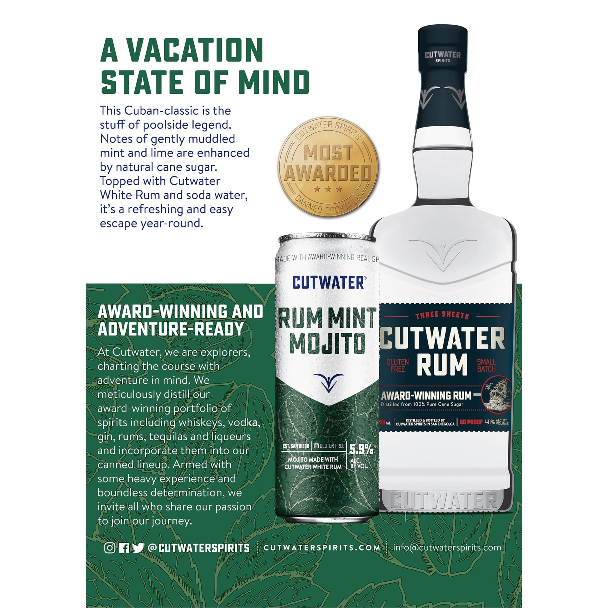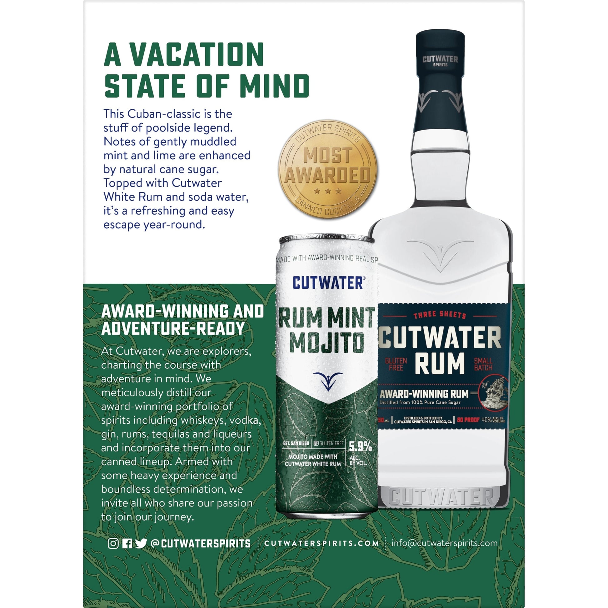 Featuring notes of muddled mint, lime and cane sugar with award-winning white rum and soda water, this Cuban classic is a poolside legend. This Cuban-classic is the stuff of poolside legend. Notes of gently muddled mint and lime are enhanced by natural cane sugar. Topped with Cutwater White Rum and soda water, it's a refreshing and easy escape year-round.