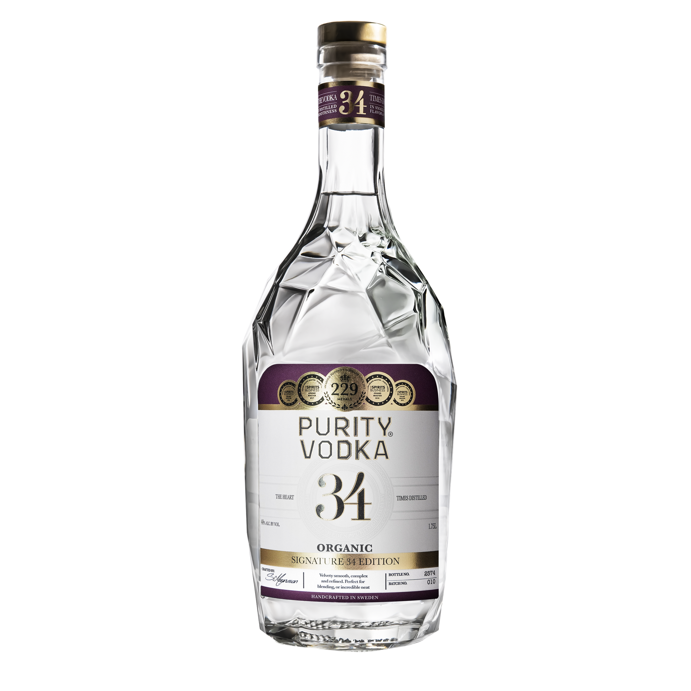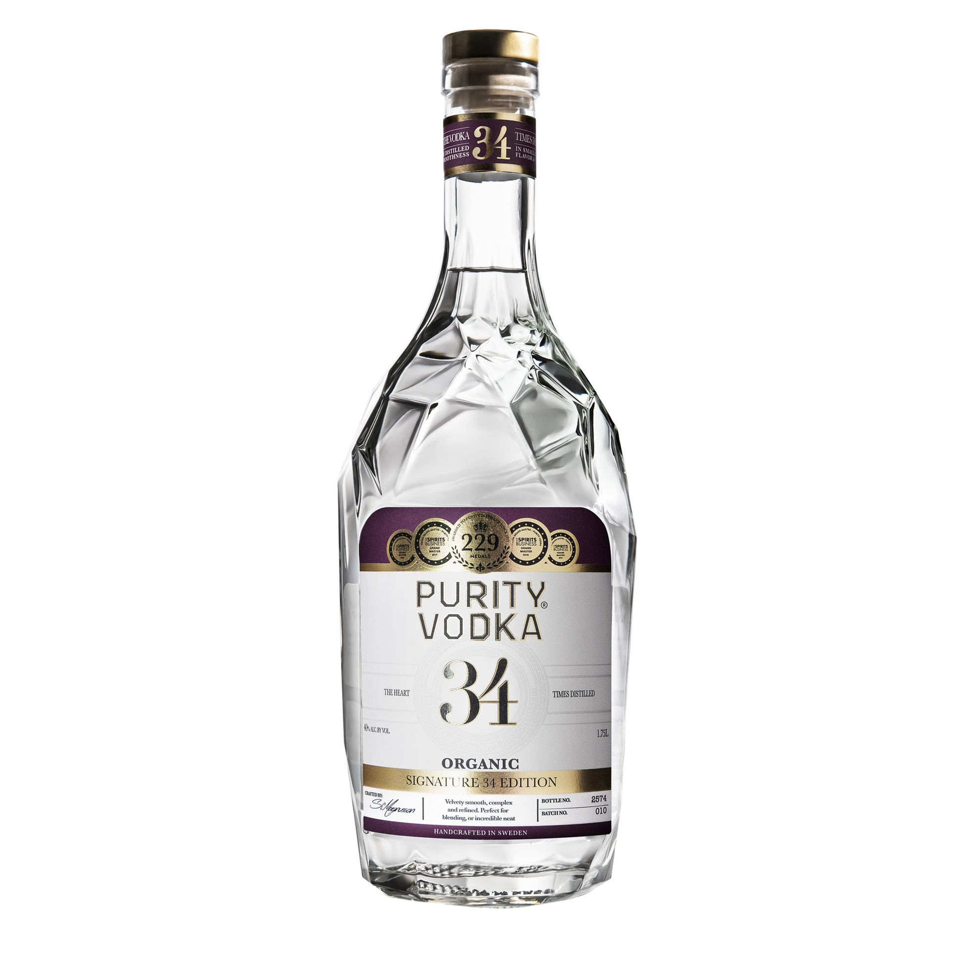 Our award-winning Signature 34 Edition Vodka has it all – layers of flavor, complexity, and smoothness.We start by slowly distilling the heart 34 times, with maximum copper contact, to bring out the distinct character of the organic winter wheat and malted barley. We then finish by adding a touch of soft natural spring water to open the flavors and create the characteristic smoothness Purity Vodka is known for. The result is unlike any other vodka.A masterpiece balancing flavor and smoothness. A flavorful mélange of bread, vanilla, and citrus is noticeable from the first sip. A smooth, burnless aftertaste invites a repeat performance.