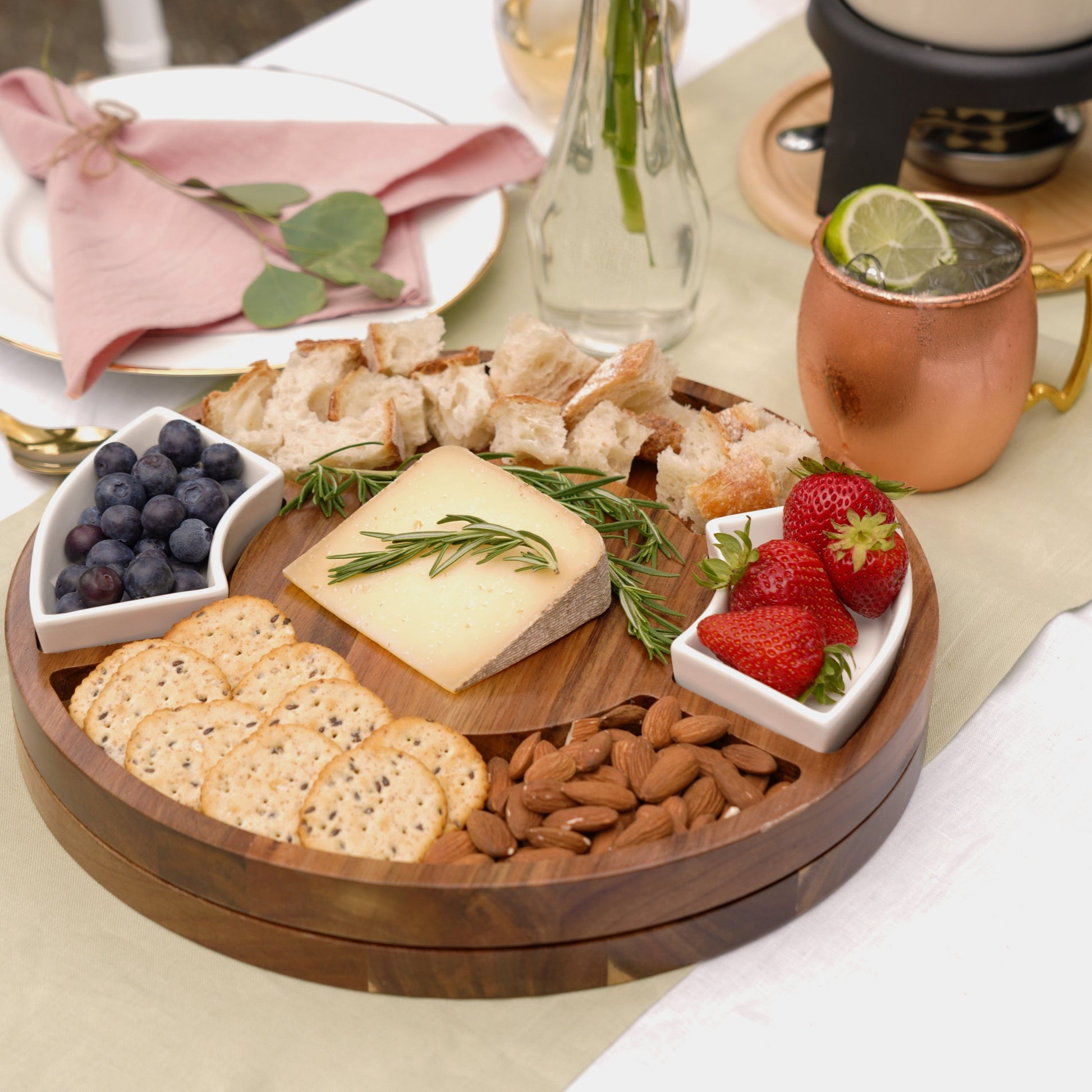 Serve cheese in style with a spinning charcuterie board. This rotating acacia wood cheese board includes separate compartments complete with two ceramic dishes for cheese, cured meat, or olives, and rotates so guests easily reach their favorites.