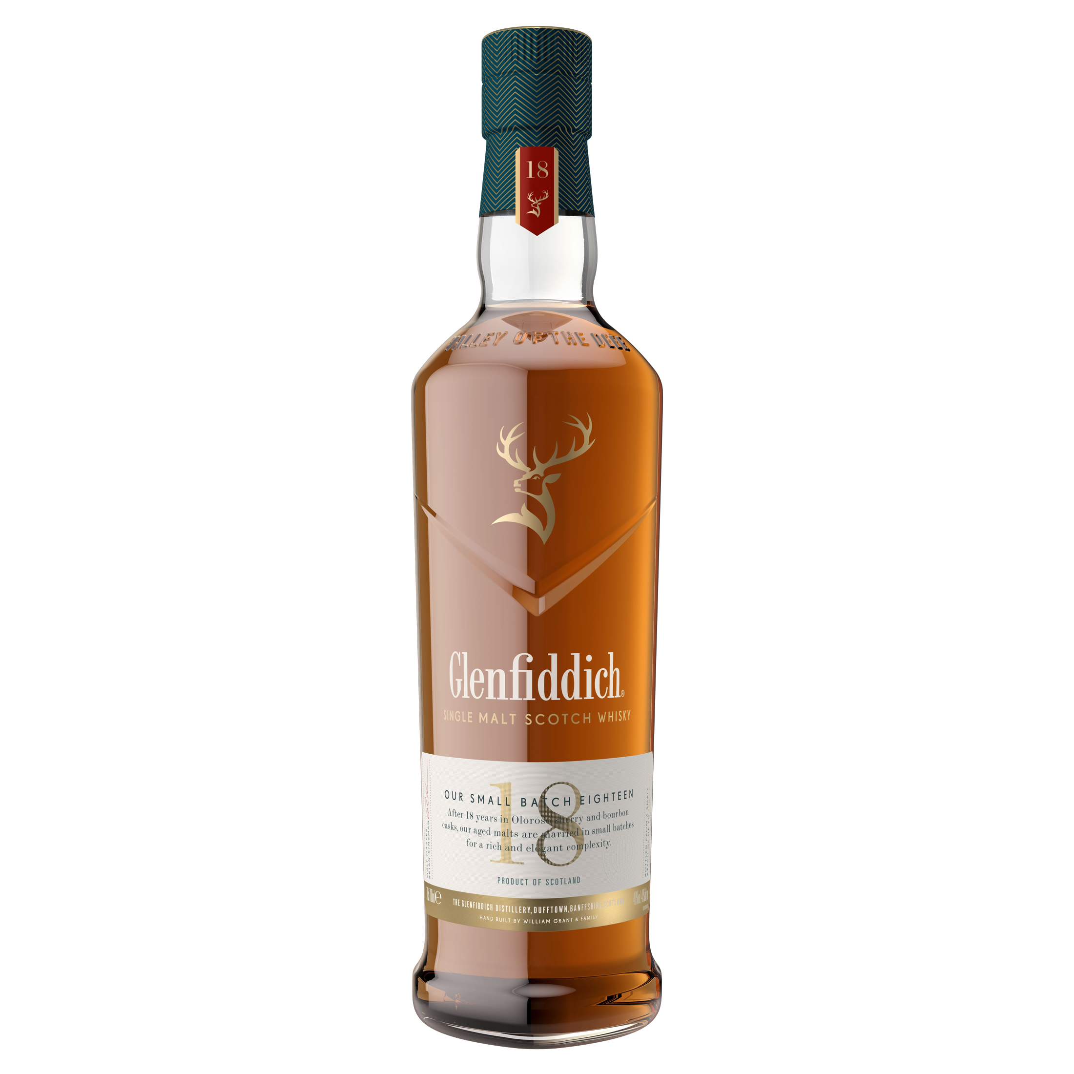 An elegant nose, faintly sweet, scented with apple and wood. Glenfiddich 18yo is a robust and full-bodied single malt whisky, yet remains remarkably soft, rounded and long lasting.
