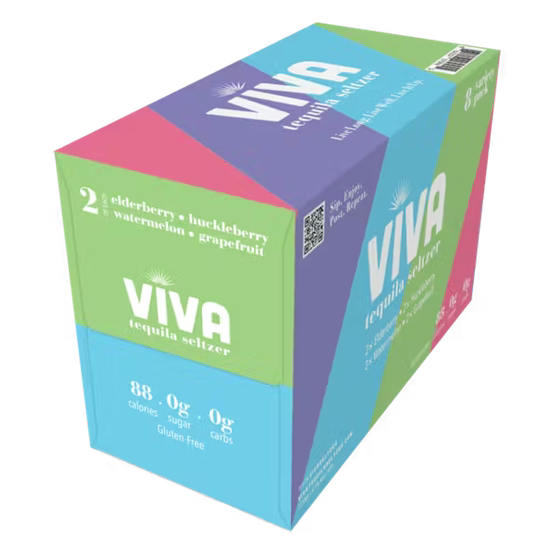 Viva Tequila Seltzer Variety Pack includes two cans of each, Elderberry, Huckleberry, Watermelon, and Grapefruit. 88 Calories, 0 Sugar, 0 Carbs, Gluten Free & 4.5%ABV