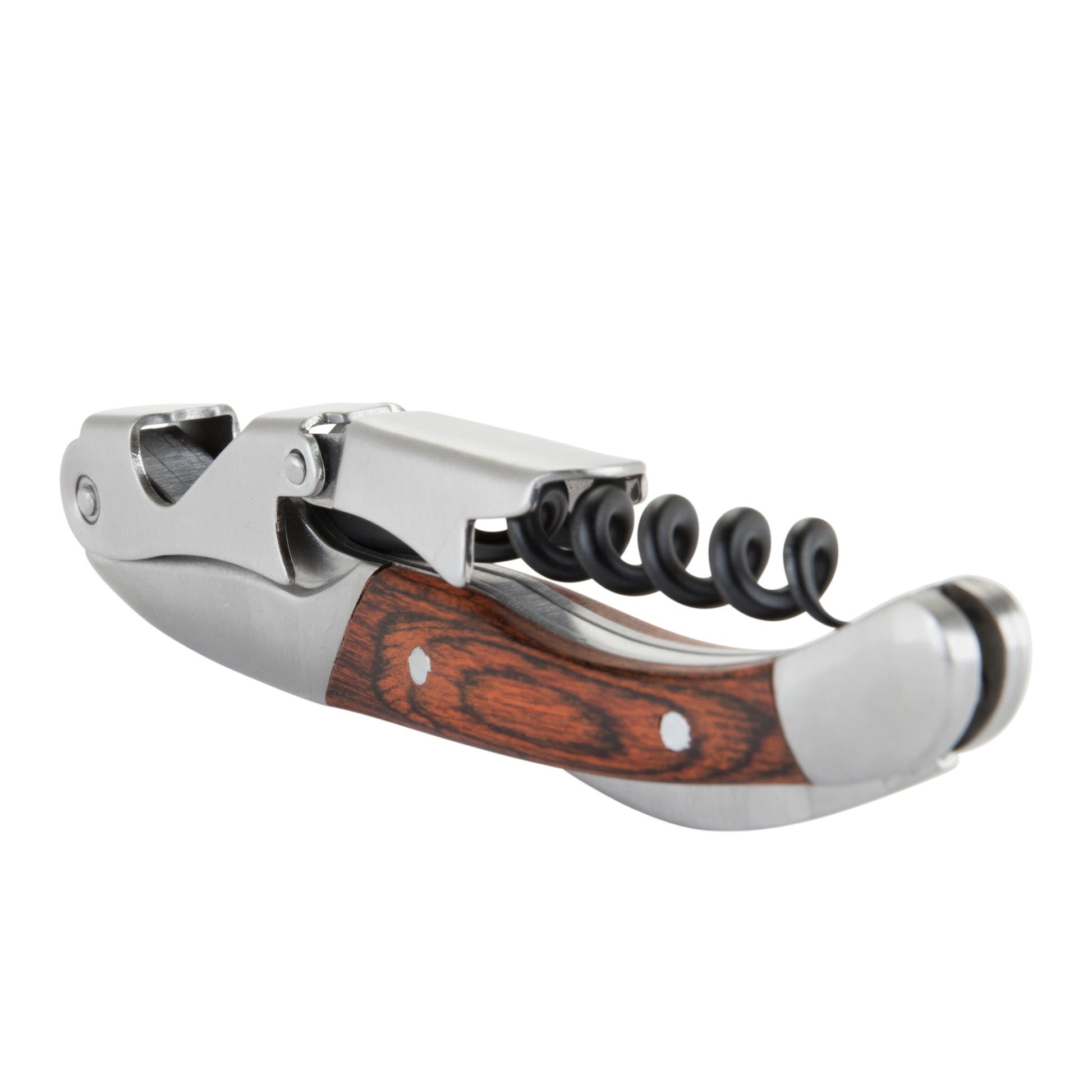 If you desire convenience and style in one package, this product was made for you. Our double-hinge corkscrew is constructed from fine wood and stainless steel, and its non-stick worm reduces friction when uncorking. A unique take on a functional classic.