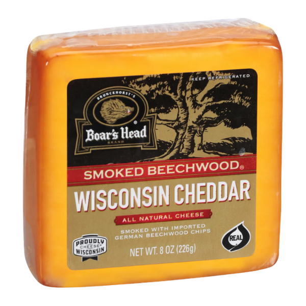 An all-American classic from Wisconsin's dairy heartland with a vibrant yellow hue, this cheese has subtle smoky notes and a sweet cream finish. Boar's Head Smoked Beechwood Wisconsin Cheddar Cheese is patiently smoked with beechwood chips imported from Germany to impart a mellow yet complex flavor.