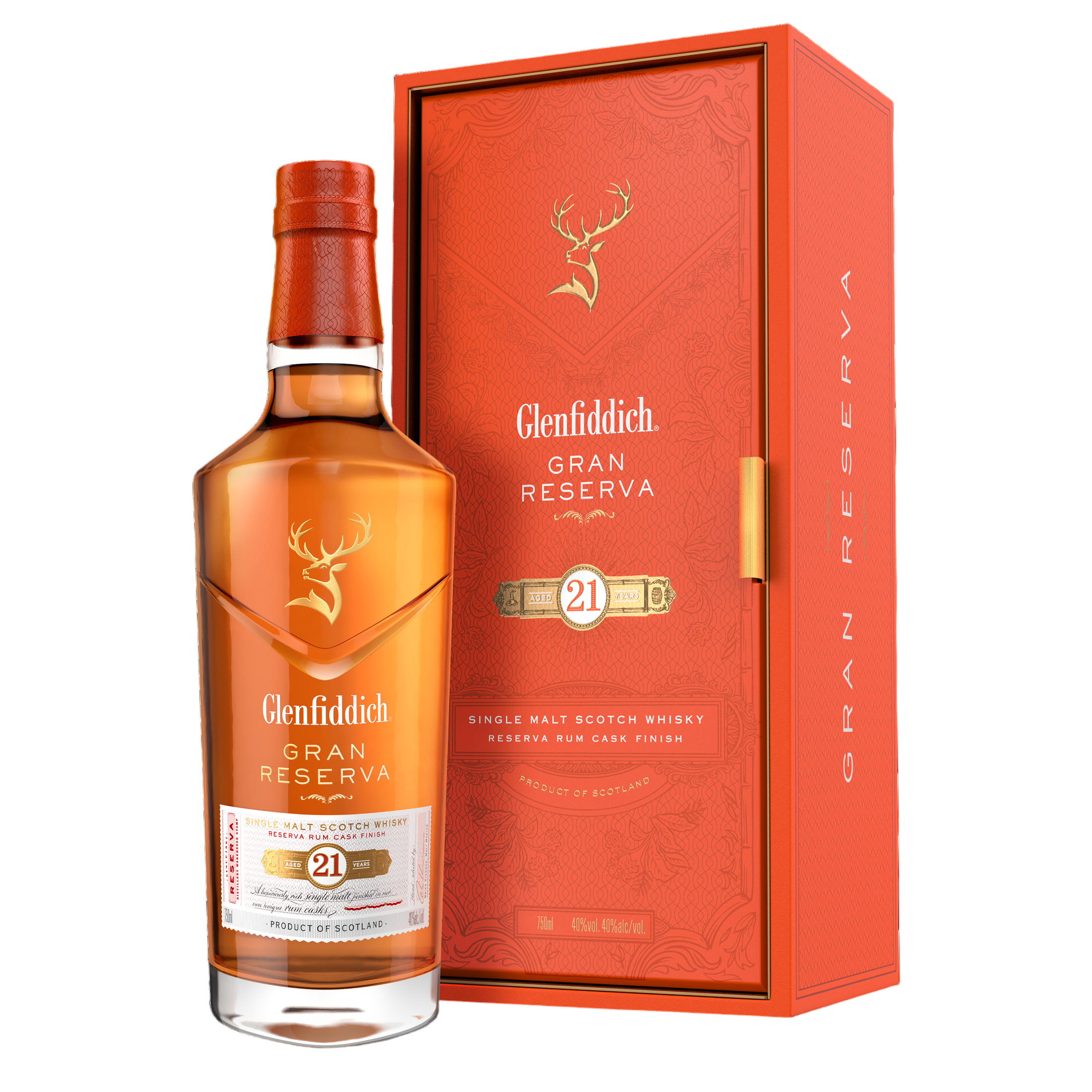 Glenfiddich Gran Reserva adds an indulgent finishing touch to any moment, transforming uncommon into unequaled. Patiently mellowed for 21 years in Scotland, it starts quiet, and restrained but rich with a defiant Glenfiddich Distillery DNA. Only when it has reached perfection does it get its time to shine. Finished in Caribbean Reserva Rum Casks to add sharp ginger, sultry fig, and uplifting lime notes that build to a crescendo of sweet toffee and spicy exotic warmth.Color: Dark GoldNose: Intense and vanilla sweet, floral, hints of banana, figs, rich toffee, new leather, and oak.Taste: Initially soft, then brisk, vibrant, and drying, peppery, with a touch of smoke, oak, lime, ginger, and spices.Finish: Very long, warming, dry and spicy.Â