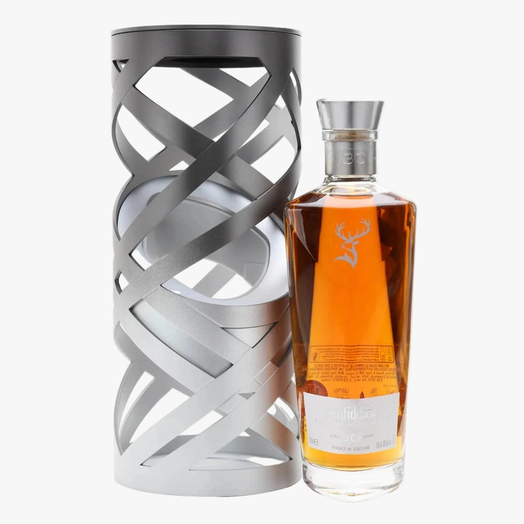 A rich and fruity limited-edition single malt from Glenfiddich, Suspended Time was matured in a combination of European and American oak for three decades before being bottled as part of the Re-Imagination of Time series. Aromas of oak spice, dried fruit, toasted walnuts and soft baking spices fill the nose, complemented by notes of heather honey, rose petals, dates, mature oak and dried figs throughout the palate. This bottle is presented in a contemporary decanter and modernist display case that gives the illusion that it is suspended in mid-air.