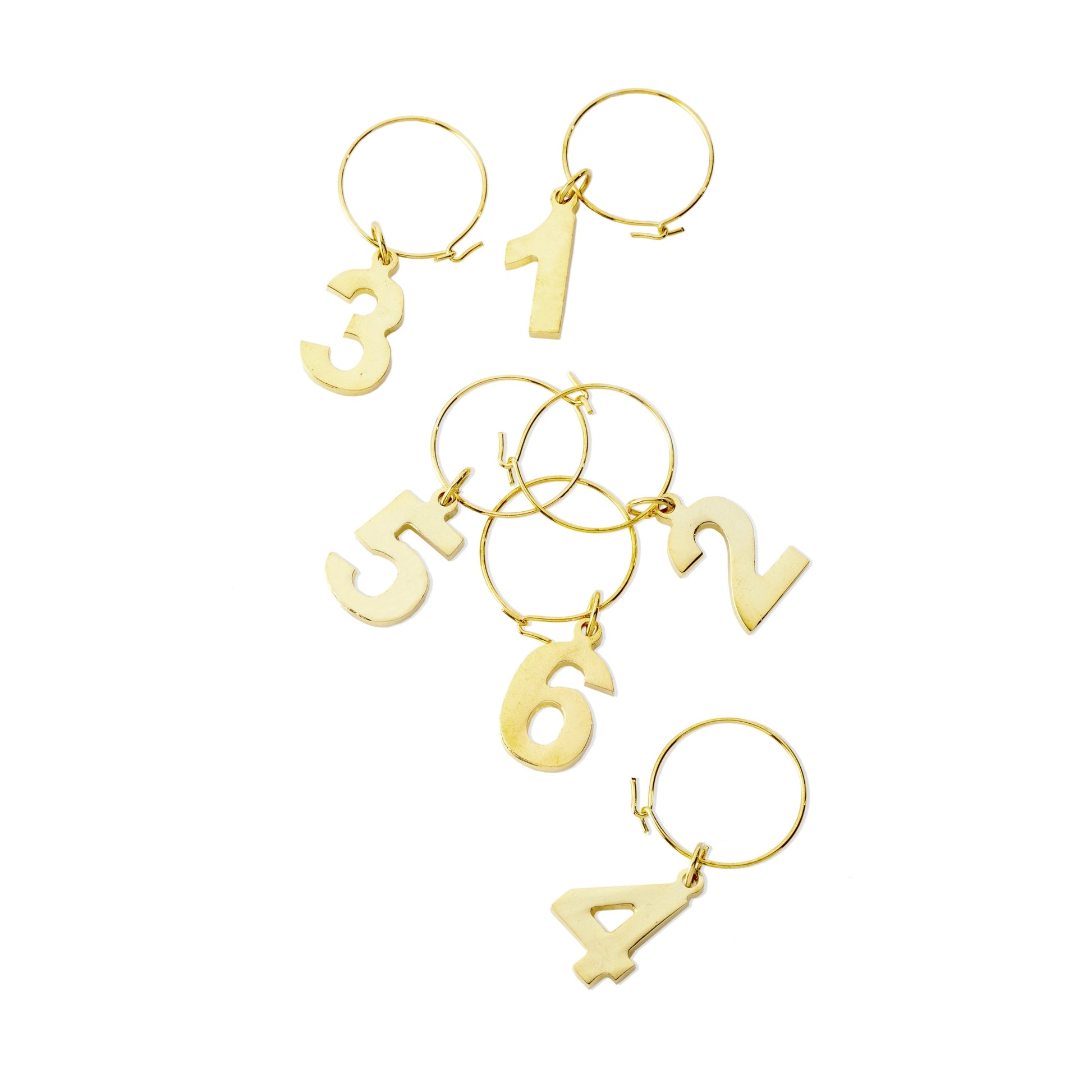 Keep tabs on glassware with a set of six bold gold wine charms. The polished numbered markers fit all standard stemware to help guests keep chiantis straight from cabernets.