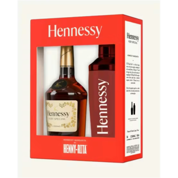 A bold gifting set featuring a 750ml bottle of Hennessy V.S and a custom cocktail shaker with etched measurements for crafting the Henny-Rita and other classic Hennessy serves. A recipe card on the back inspires easy cocktail-making at home.