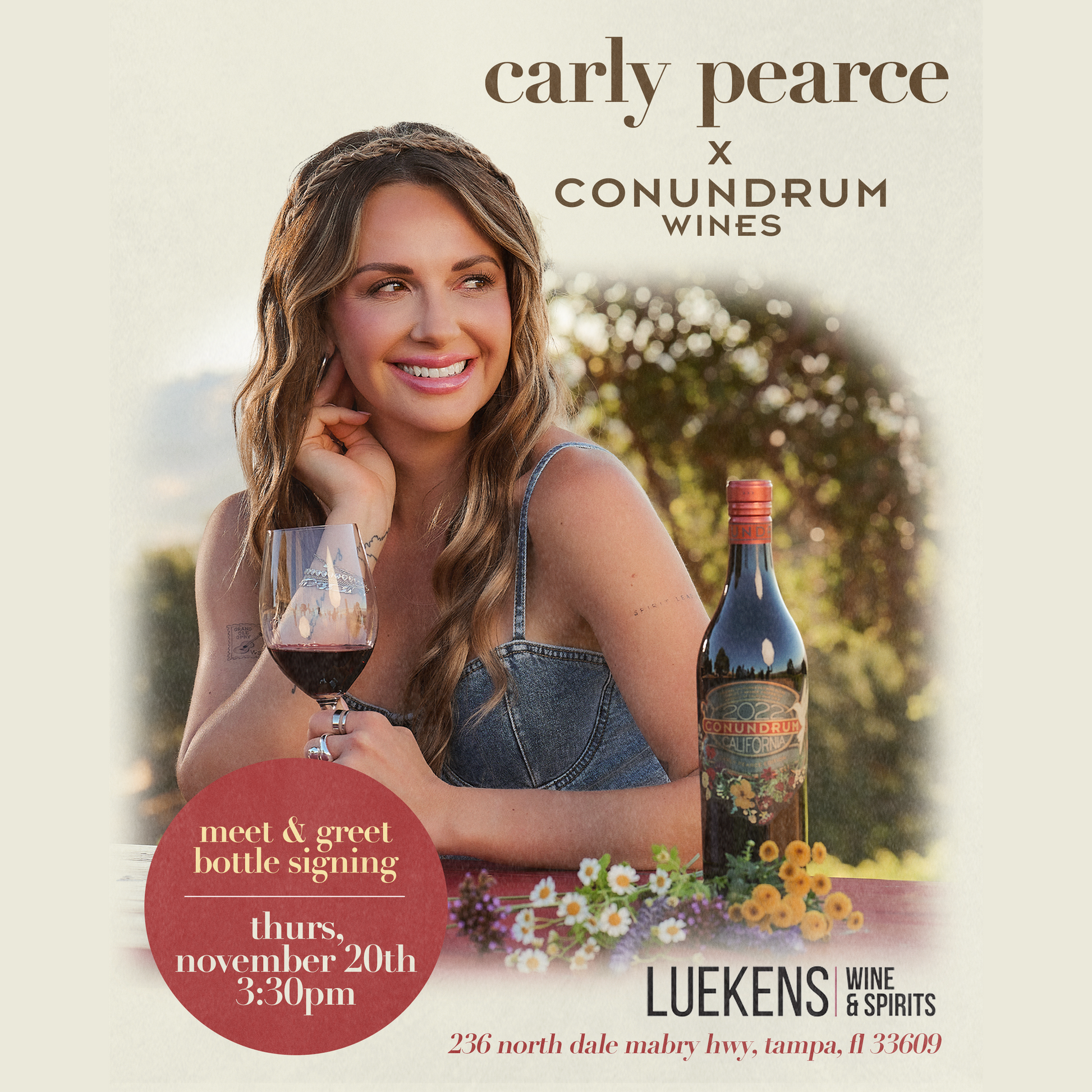 Join us for a Bottle Signing and Meet & Greet with Grammy Award-winning singer-songwriter Carly Pearce and Conundrum Wines on Thursday, November 20th, from 3:30 PM β 5:00 PM at Luekens MIDTOWN!
