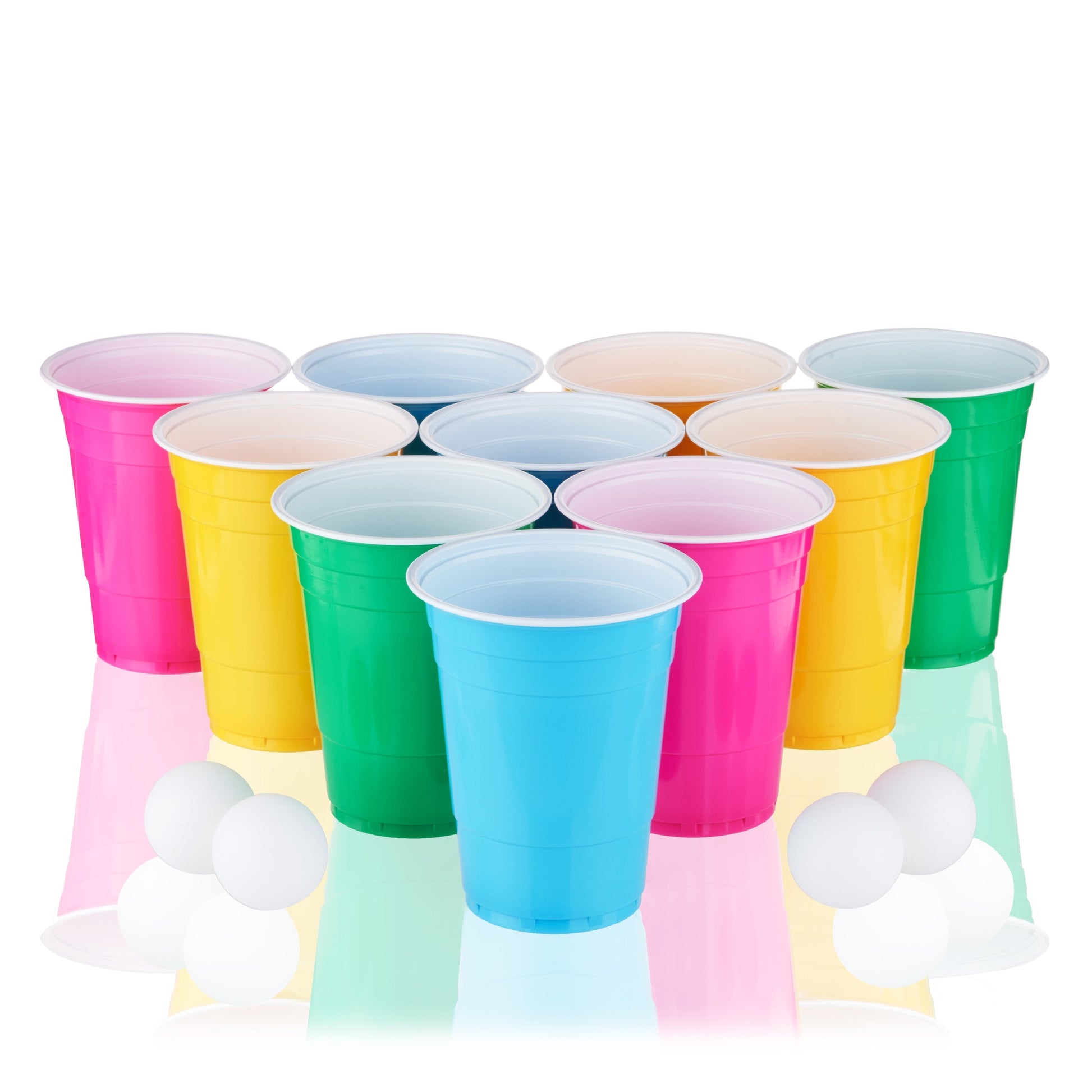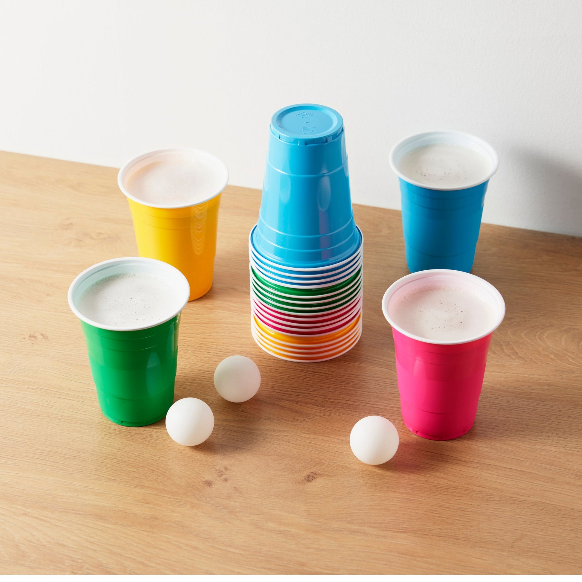Get the party started with this neon beer pong set. Complete with classic party cups in bright pink, green, blue, and yellow and four standard ping pong balls, this set is disposable for easy cleanup. Flex your college skills with friends!