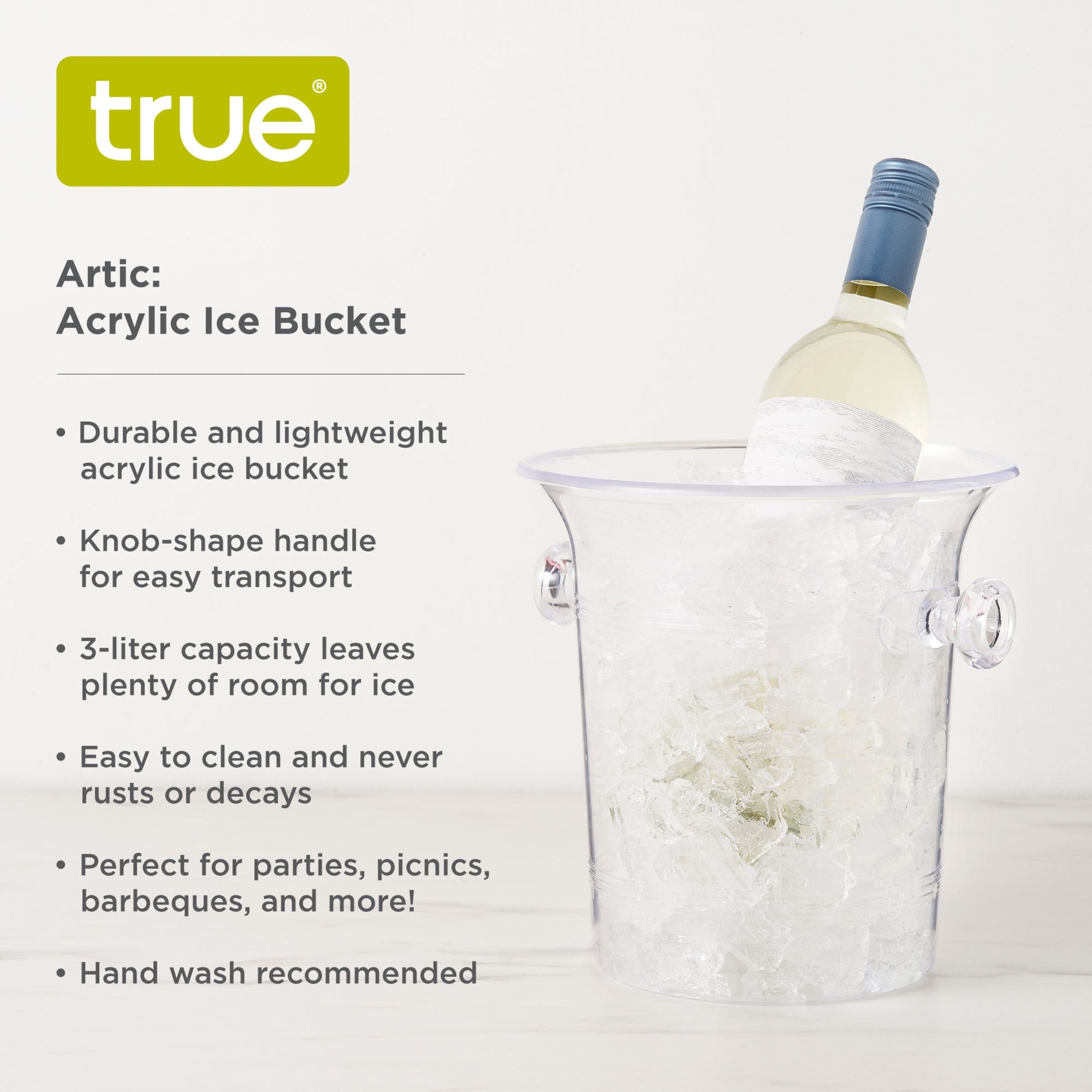There’s nothing like wine chilled directly over ice. This classic ice bucket combines the classy clear look of glass with the weight of plastic for an attractive vessel to ice wines from chardonnay to champagne. Great for beer or juice, too! Grab it by the handle and go chill.