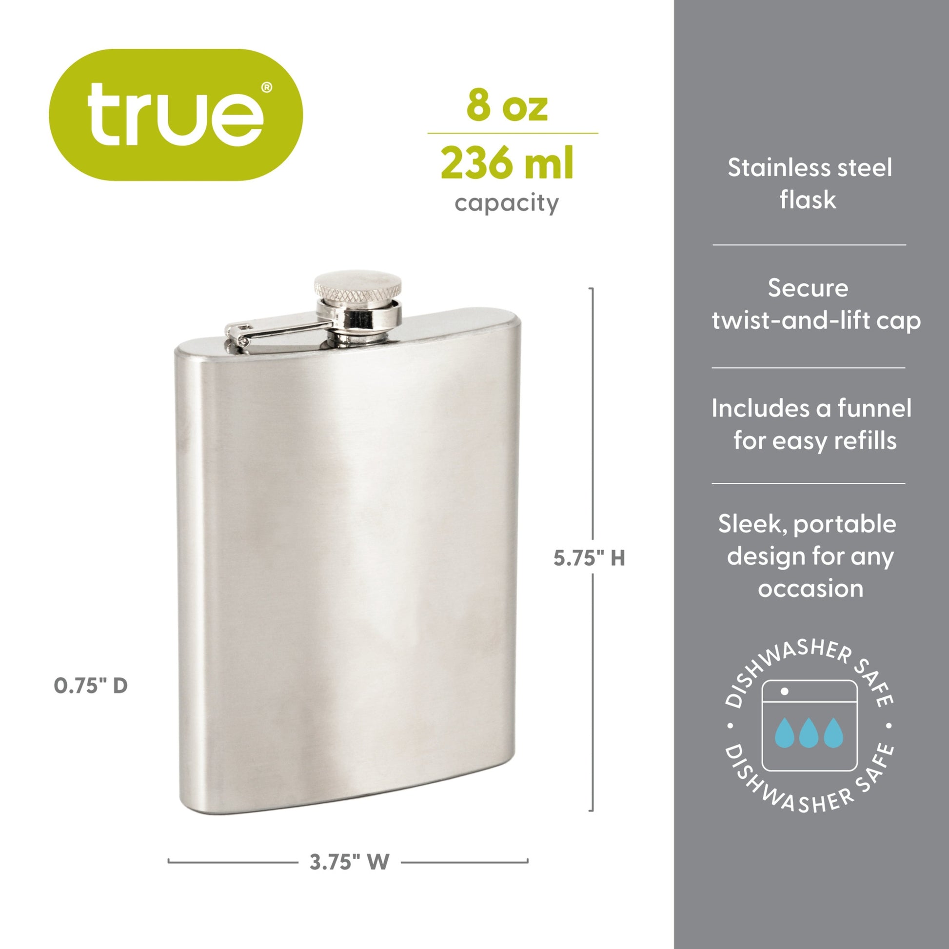 The Trueflask 8 oz Stainless Steel Flask is your go-to accessory for enjoying drinks on the go. Crafted from durable stainless steel, this sleek flask features a secure twist-and-lift cap to prevent spills and a refill funnel for added convenience. Perfect for outdoor events, travel, or gifting, it combines practicality and style in one compact design.