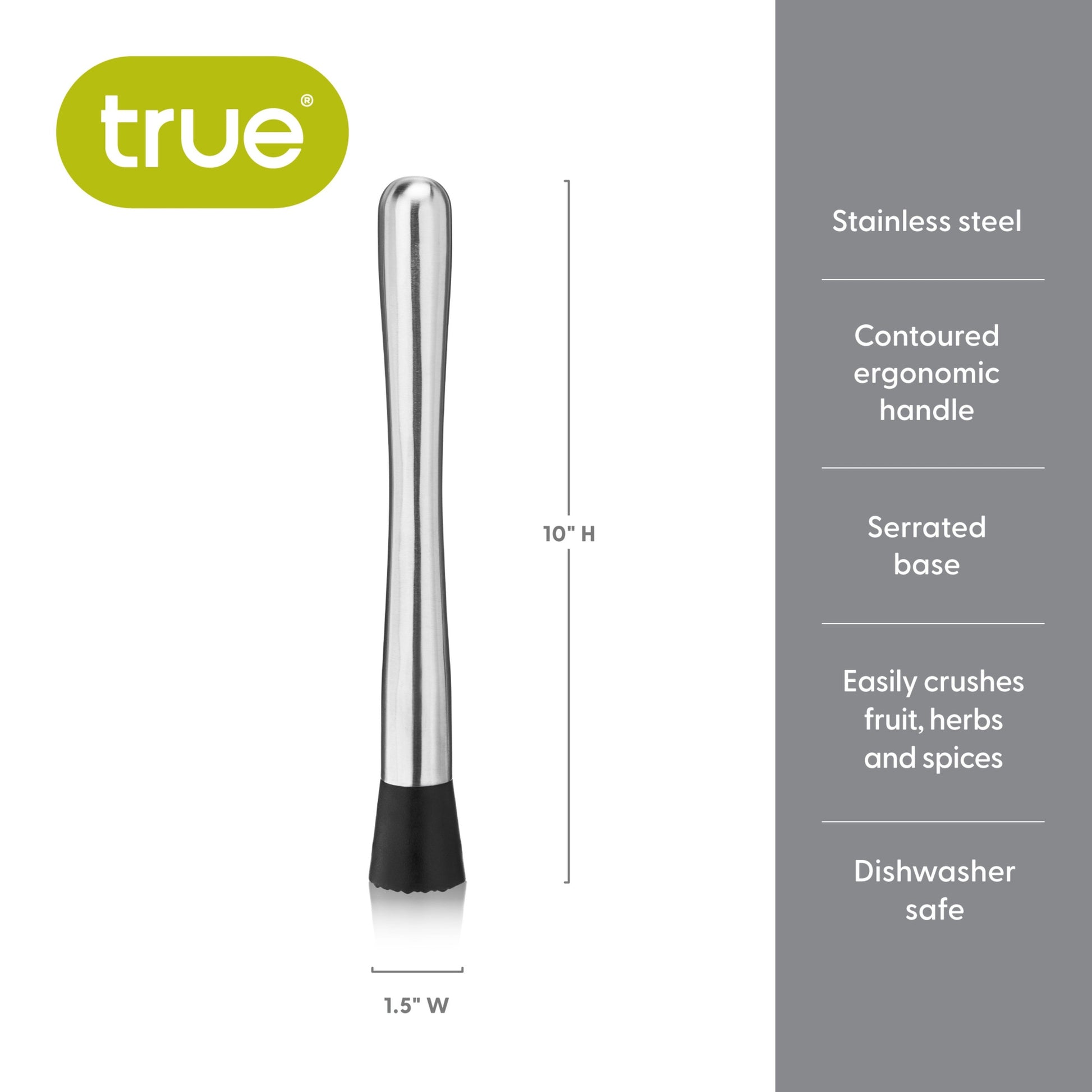 Sleek Stainless Steel Muddler grips citrus fruits, berries, spices and herbs to crush them quickly, and it looks good while doing it. Its sleek Stainless steel handle gives the classic muddler a modern refresh. Step into the future, smashingly good cocktails are just muddle away.