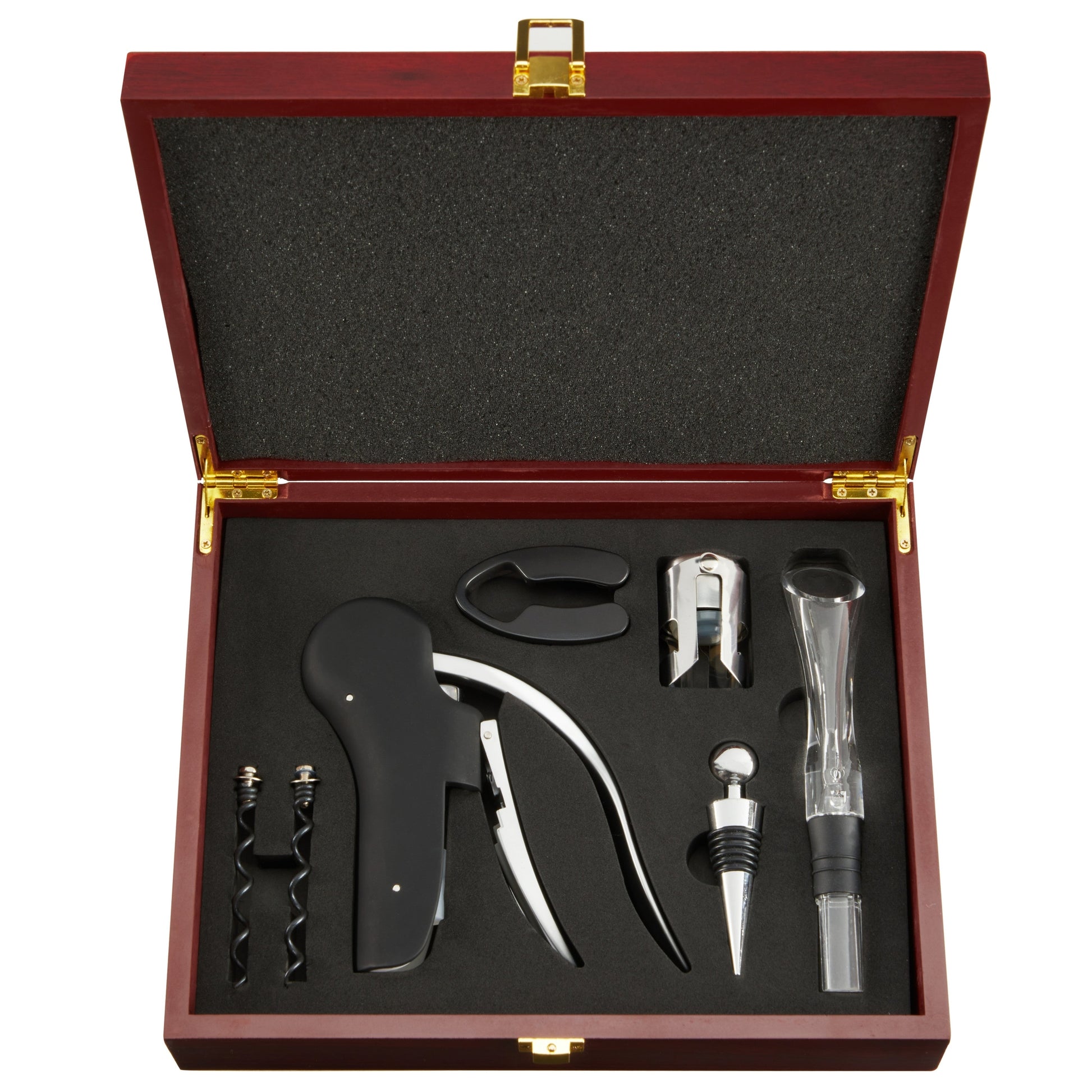 - Includes: lever corkscrew with two worm options, a foil cutter, chrome bottle stopper, aerator pourer, and a champagne stopper